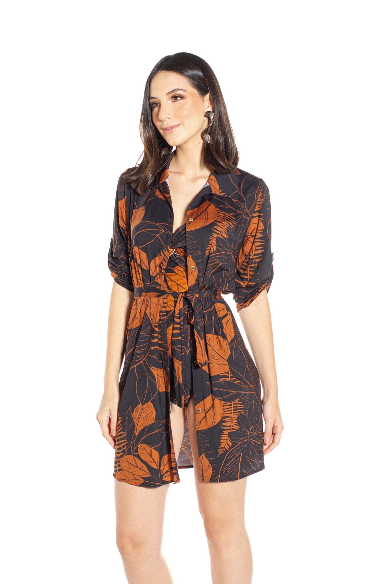 Kaftan Frente-Costas Crepe Folhagem Terra